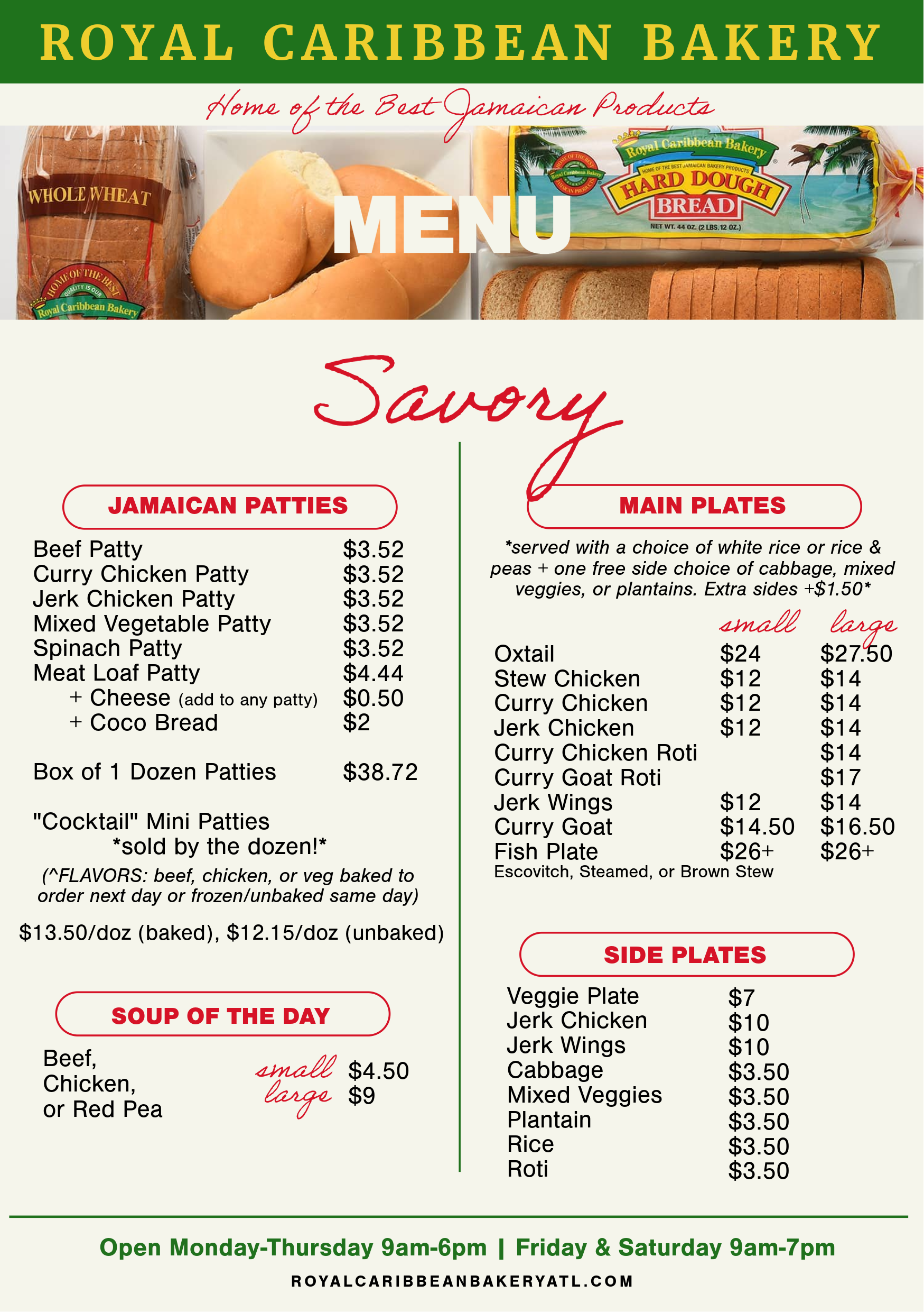 Royal Caribbean Bakery offers the finest quality Jamaican patties, hard dough bread, spice buns, coco bread, pastries, bulla cakes and black fruit cakes, and several other Caribbean favorites.